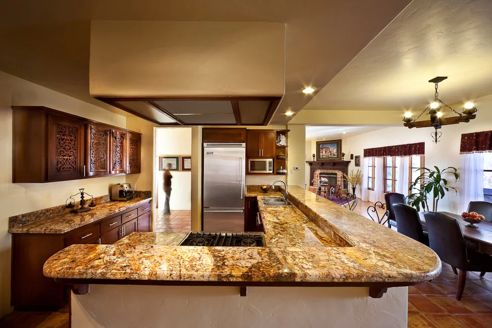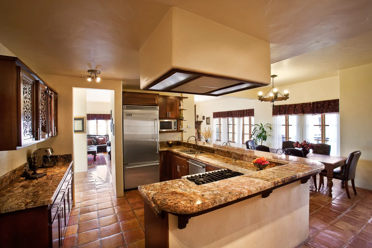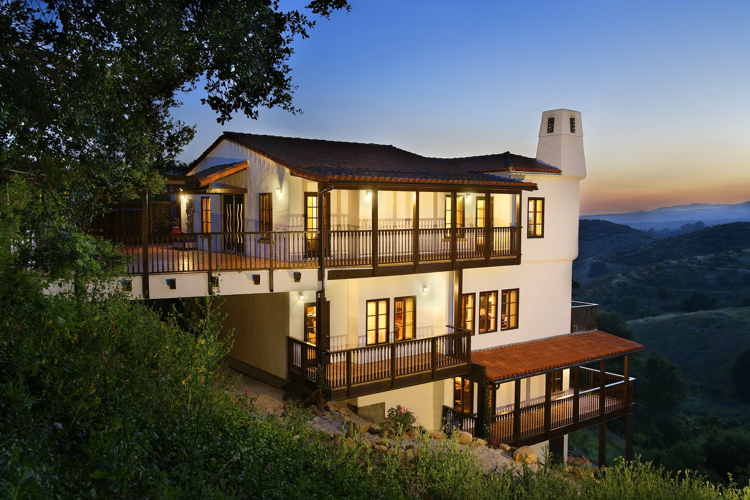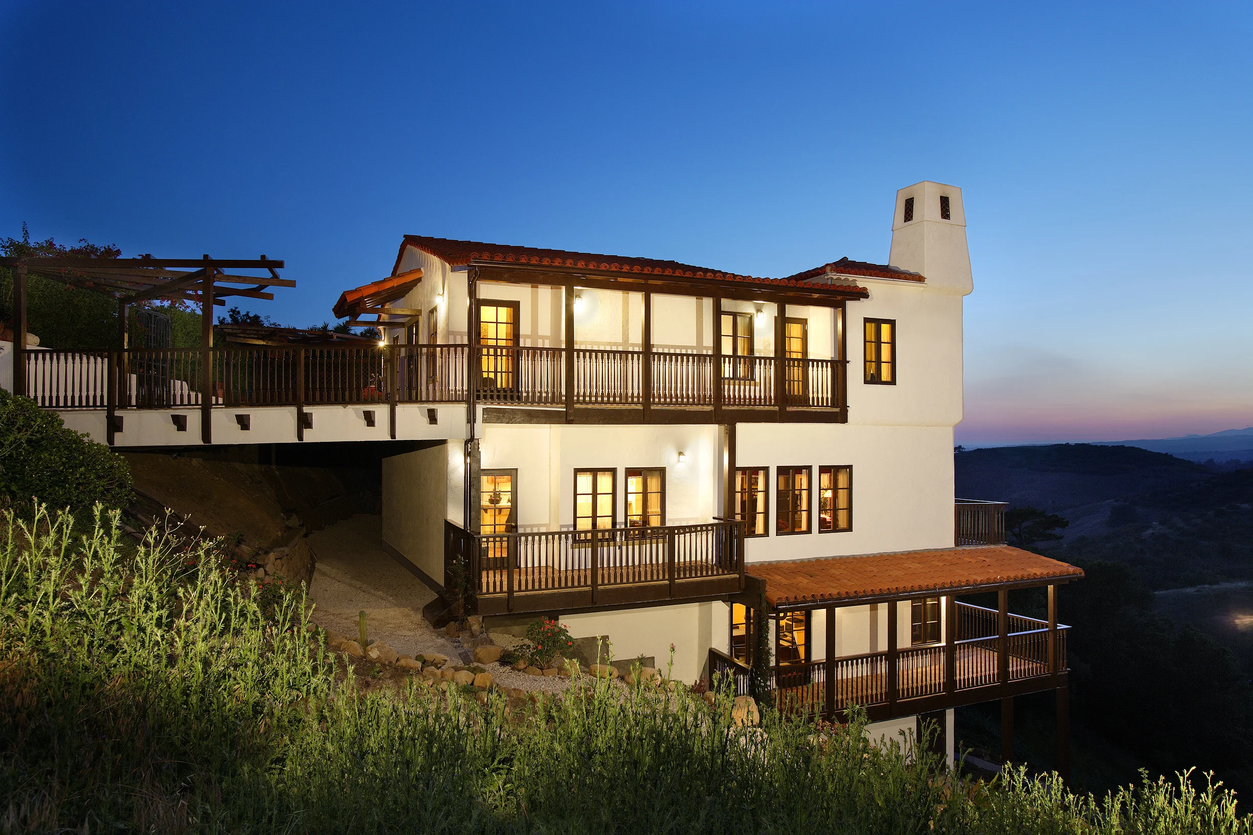 This Mission Canyon home shows a low street level profile, while accommodating the extended family living needs of the owners. The design takes advantage of the challenging hillside location by employing two multilevel structures connected with decks that fit naturally into the topography. The result is a home with multiple, versatile spaces that can be easily repurposed for the evolving needs of the owners. The open-floor layout is enhanced by the careful choice of materials and the extensive use of windows that bring in the light and connect to the beautiful canyon and ocean views. The feel is relaxed, yet consistent with the traditional Spanish style. The site is enhanced by the restrained hardscape and the generous use of colorful, drought-resistant native plants.