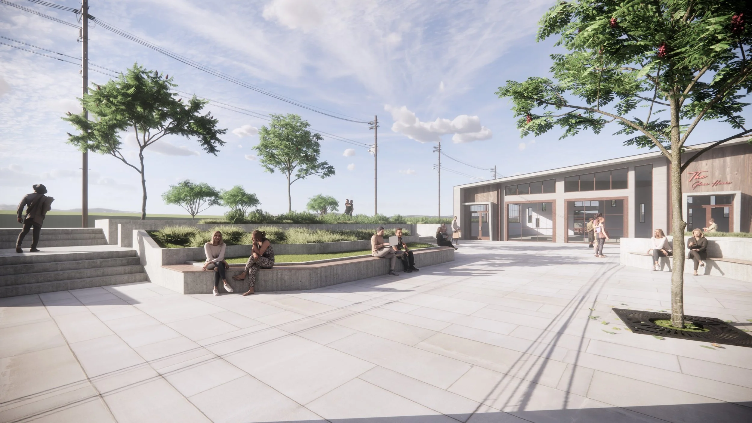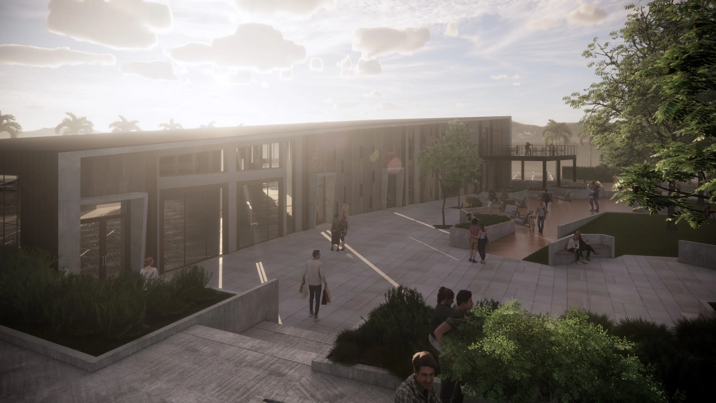 He envisioned a modern complex, a breath of fresh air, amidst surrounding traditional buildings. The task was to create a New Mixed-use Development, 20,000 SF of commercial space with a central courtyard, parking, and site improvements (paths, planters, water fountains, gabion wall, trellis, and landscape features).